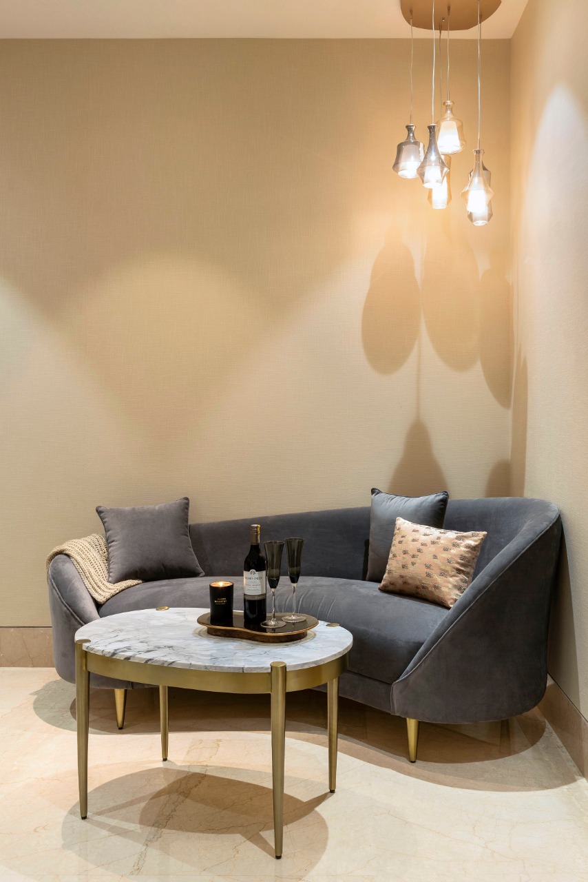 A stark contrast to these spaces is the living area that has been moulded to be a relaxed, clean and sleek room. The design element to look out for here is the intricately detailed hanging staircase made using brass with marble and veneer. The veneer-covered wall here camouflages two doors beautifully. While one door on the landing leads to the home theatre, the one under the staircase leads to a powder room. The home theatre has European style walls with wide comfortable leather sofas that gives the space a relaxed vibe. The two yellow chairs add vitality to this space.